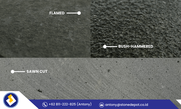 2. Finishing bertekstur & anti-selip: Flamed, Bush-Hammered, Sawn