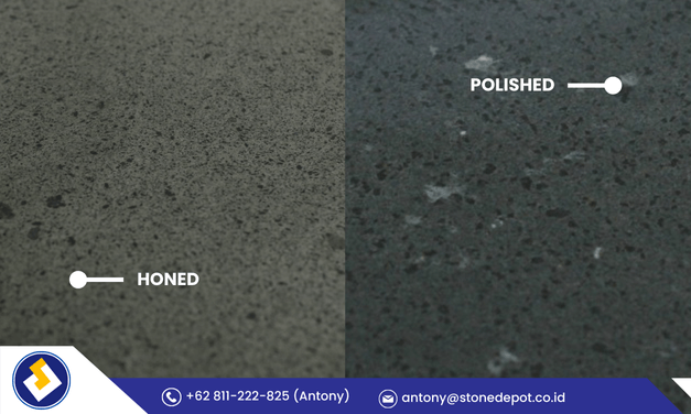 - Honed: halus tapi tidak mengkilap (lebih doff). Secara tampilan tetap elegan, tapi biasanya lebih “aman” dibanding polished untuk area indoor tertentu.