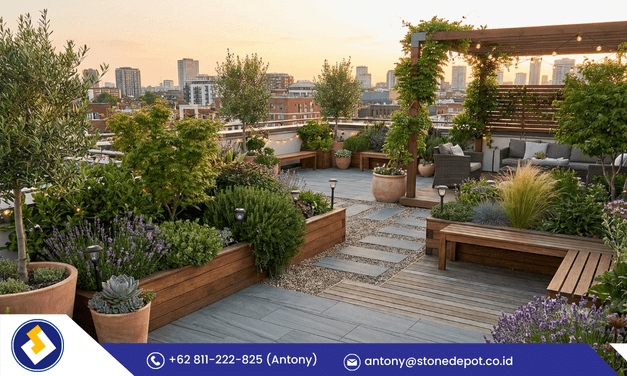 Yang menarik, batu ini juga bisa membantu rooftop tidak terasa flat. Karena teksturnya natural, area rooftop garden terlihat lebih hidup meski desainnya minimal.
