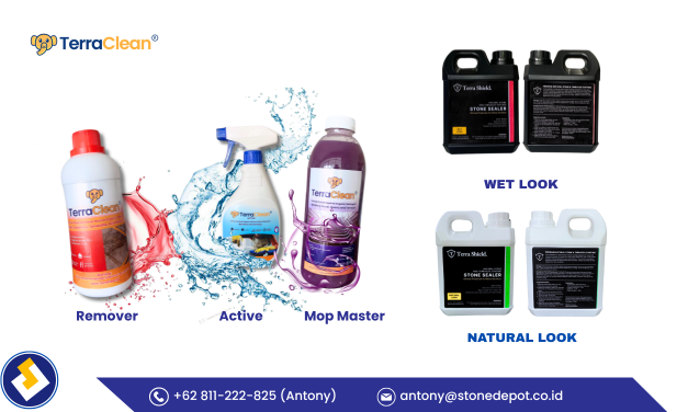 - Menjaga pori batu tetap aman, pilih pembersih khusus batu alam yang lembut dan tidak menghancurkan pigmen alami. Beberapa produk premium seperti Terraclean biasanya dirancang khusus untuk kebutuhan ini.