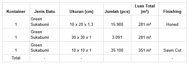 Setiap ekspor Green Sukabumi Stone adalah bukti komitmen Stone Depot untuk menghadirkan kualitas terbaik dari Indonesia ke dunia. Dari tambang hingga pelabuhan, dari pabrik hingga gudang klien kami memastikan setiap batu tiba dalam kondisi sempurna.
